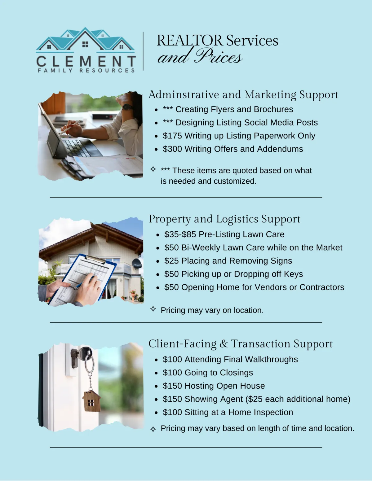 Attention Realtors: At Clement Family Resources, we want to assure you that when we provide Realtor Services, we are representing you—not ourselves. Our focus is on supporting your business and serving as an extension of your team, while maintaining the highest level of professionalism, integrity, and care in every interaction.